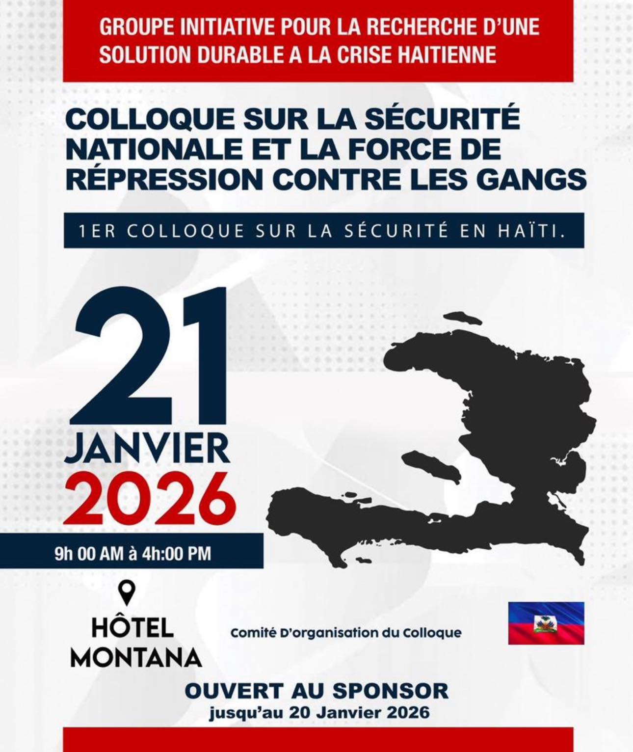 Face à la dégradation persistante de la situation sécuritaire en Haïti, un Colloque national sur la sécurité se tiendra le mercredi 21 janvier 2026, à l’Hôtel Montana, à Pétion-Ville, de 9h00 à 16h00. Placée sous le thème « Entre souveraineté nationale et Force de Répression des Gangs (FRG) », cette initiative entend poser les bases d’une réponse nationale structurée à la montée des gangs armés et à l’affaiblissement de l’autorité de l’État.