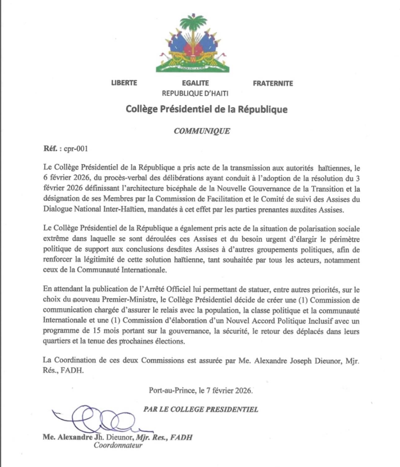 Port-au-Prince, 7 février 2026 — Le Collège présidentiel de la République a confirmé avoir pris acte de la transmission, le 6 février 2026, du procès-verbal des délibérations ayant conduit à l’adoption de la résolution du 3 février 2026 définissant l’architecture bicéphale de la nouvelle gouvernance de la transition. Cette démarche a été menée par la Commission de facilitation et le Comité de suivi des Assises du Dialogue national inter-haïtien, mandatés par les parties prenantes aux Assises.